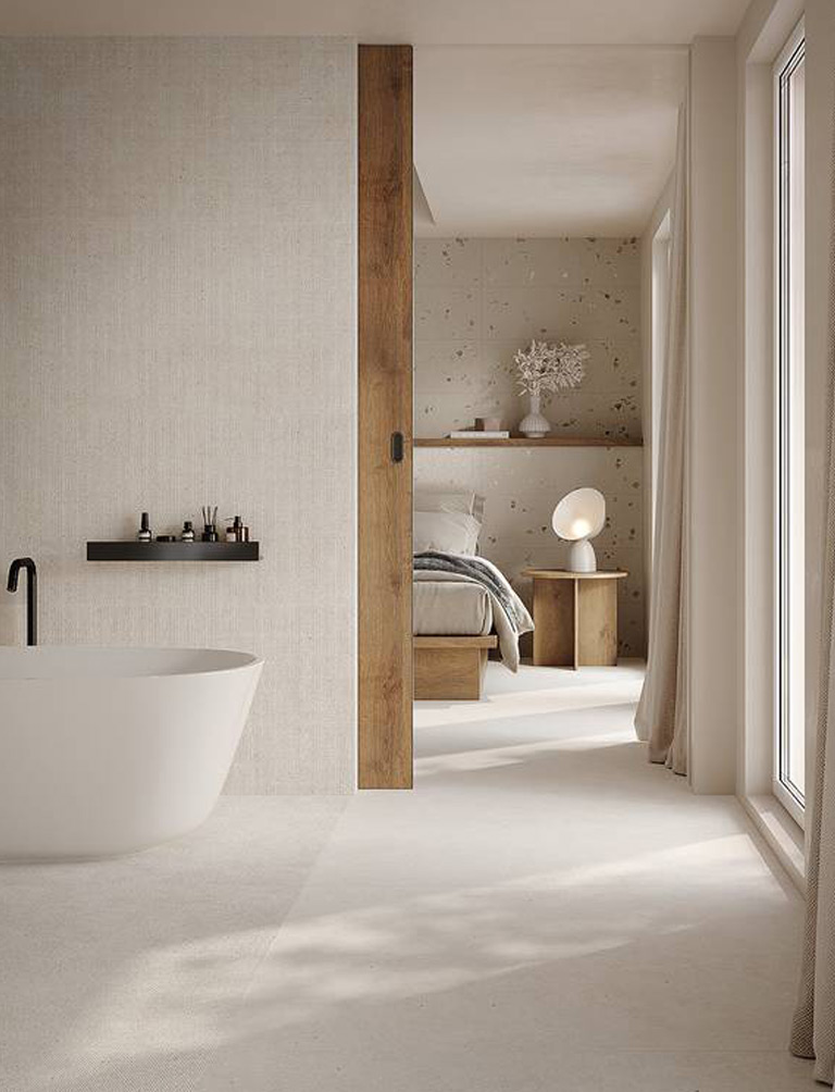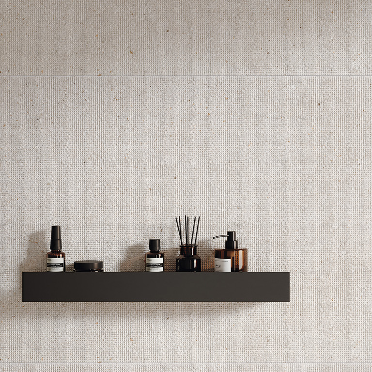 Bei Fliesen und Wandbelägen bzw. Verkleidungen ist der Farbton nicht nur neutral: Er wird zu einem leuchtenden Hintergrund, der Oberflächenstrukturen, Materialien und Lichtspiele zur Geltung bringt und Räume schafft, die Ruhe, Ausgewogenheit und zeitlose Moderne ausstrahlen.
