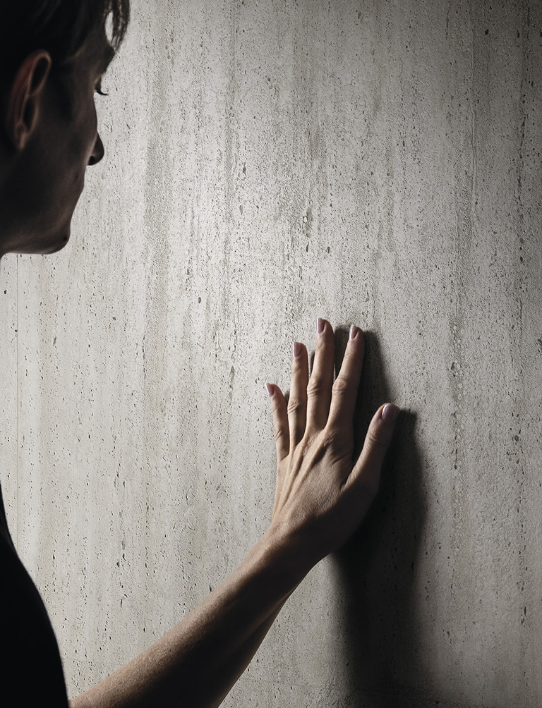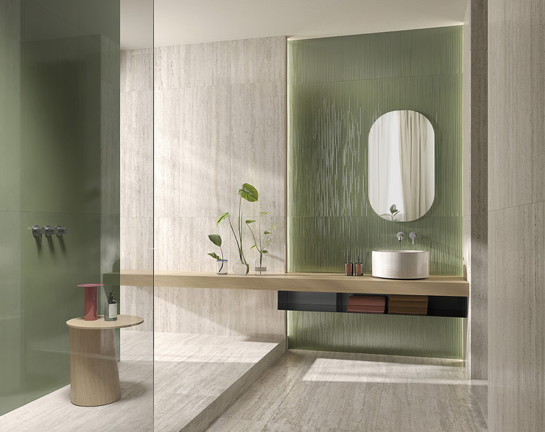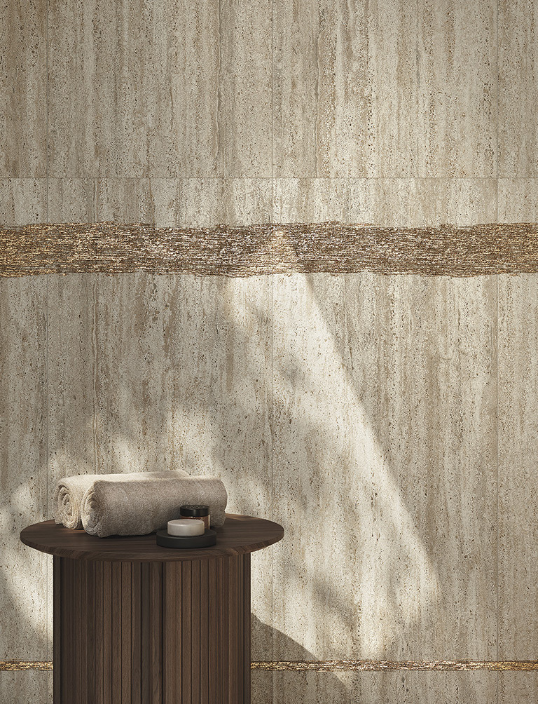 Die Dekore stehen im Dialog mit den Oberflächen in Travertinoptik und schaffen ausgewogene und raffinierte Kontraste.