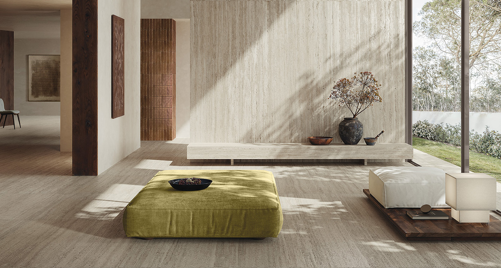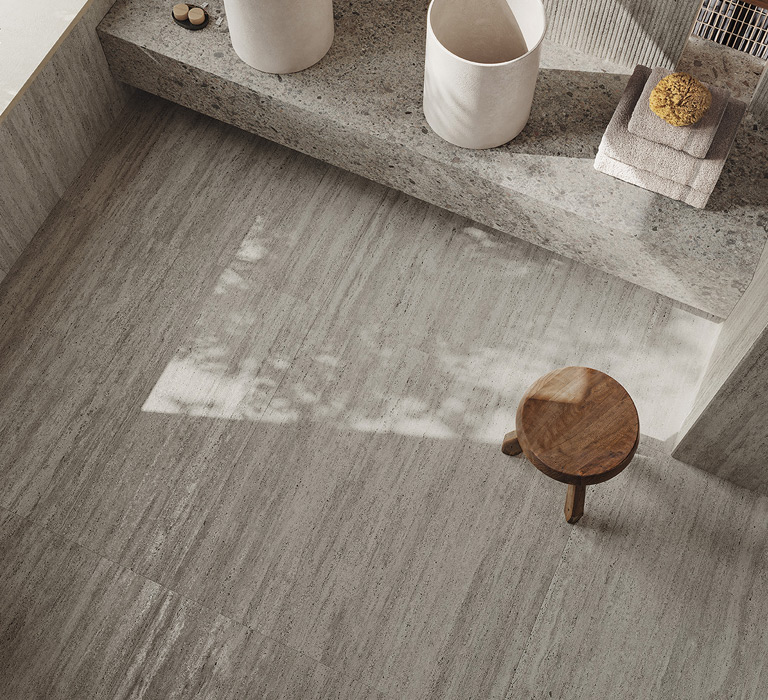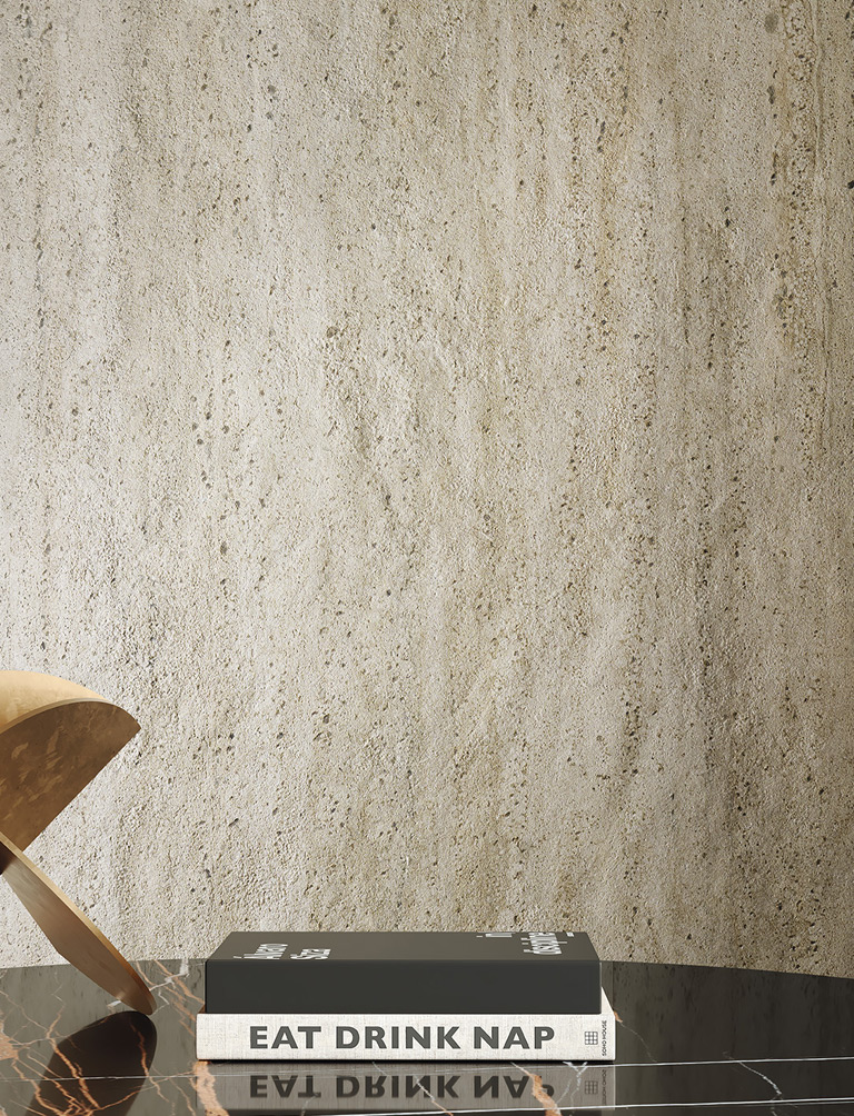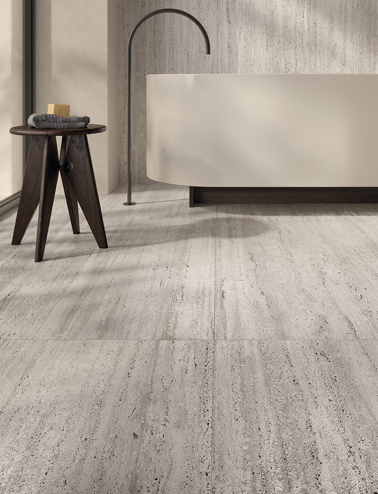 Travertin ist der Inbegriff italienischer Eleganz und erlebt eine Wiedergeburt aus moderner Keramik, die klassische Erinnerung und eine zeitgemäße Sichtweise miteinander vereint und kleine Unvollkommenheiten, Rillen und natürliche Strukturen in visuelle Tiefe und zeitlose Schönheit verwandelt.