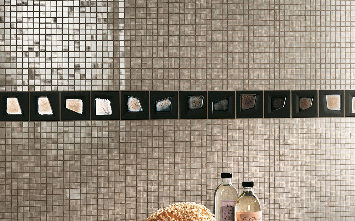 Das Dekorrepertoire wird durch die verchromten und satinierten Leisten 1,5x9,5 in Black, Silver und Orange vervollständigt, die Leiste Pat Jewel 10x30,5 ist ein echtes Schmuckstück, das dem Raum einen einzigartigen Eindruck verleiht, und durch Angoli, das für jedes grafische und chromatische Element der Kollektion erhältlich ist, abgerundet wird.