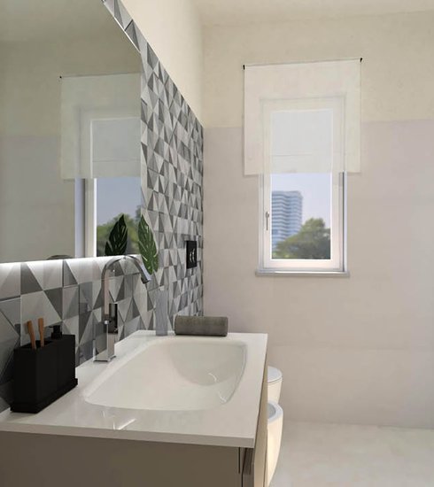 Raumabbildung Bad, gestaltet mit Fliesen aus der Kollektion: MILANO MOOD – GRAU, Azzurro, WEISS