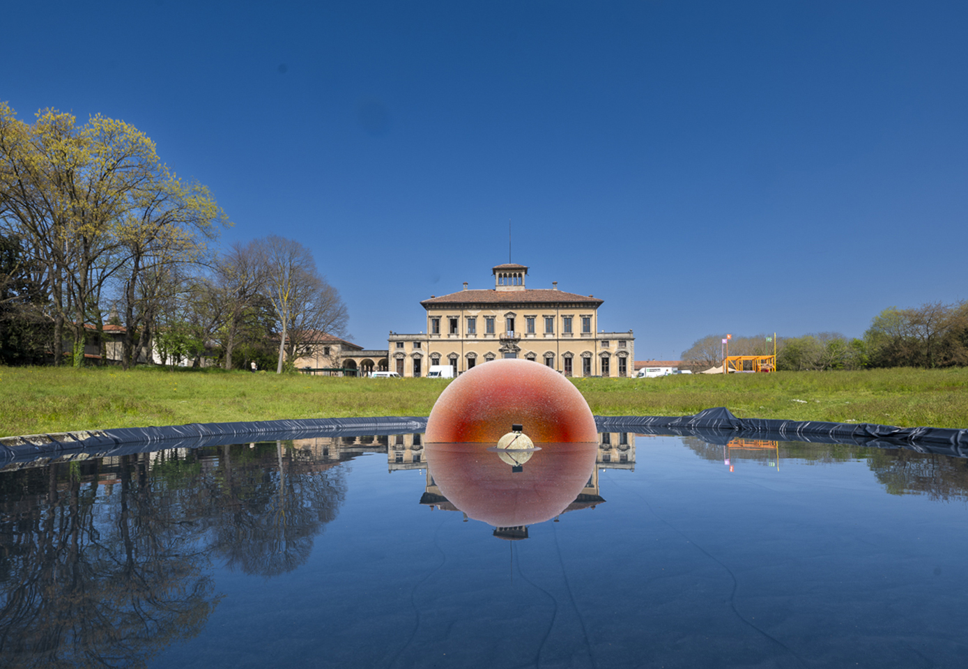 Historic villa with lawn and reflective water feature, red spherical installation in the centre in front of the façade.