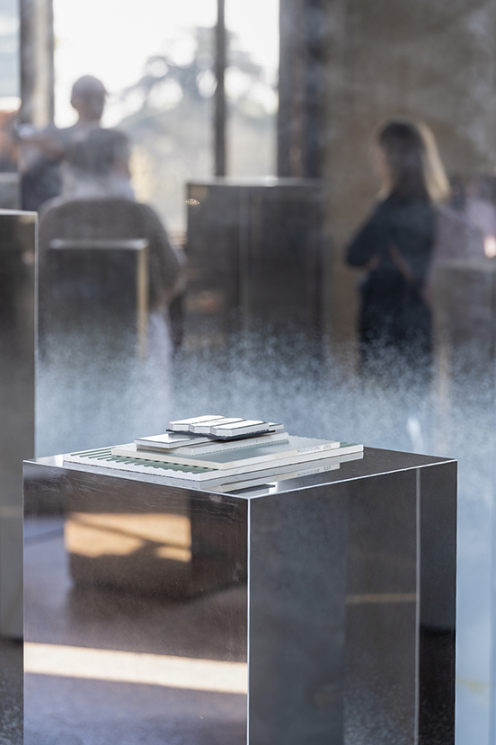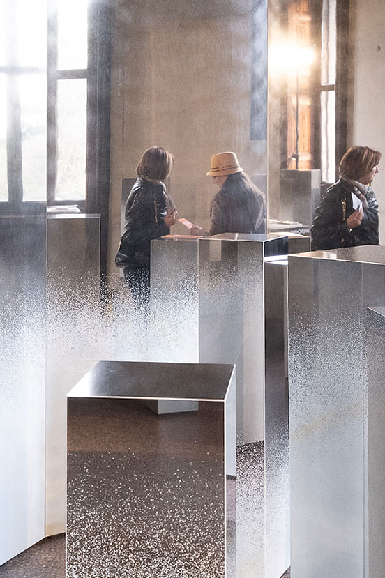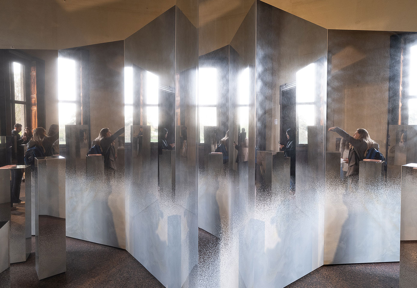 Frozen Forest installation: shaded mirrored ceramic columns reflecting visitors and natural light inside the room.