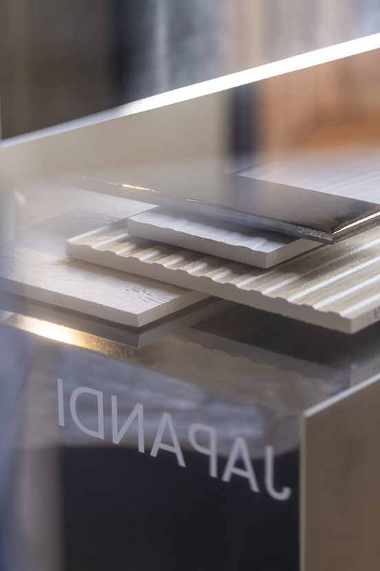 Detail of ceramic samples displayed on a mirrored base with Japandi lettering, textured and reflective surfaces.