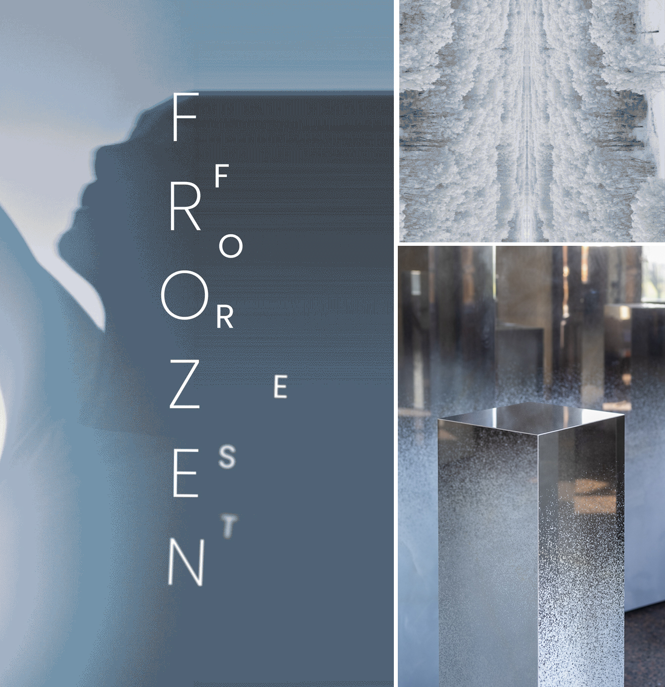 Frozen Forest visual collage: blue silhouettes, icy textures and reflective ceramic totems with a gradient effect.