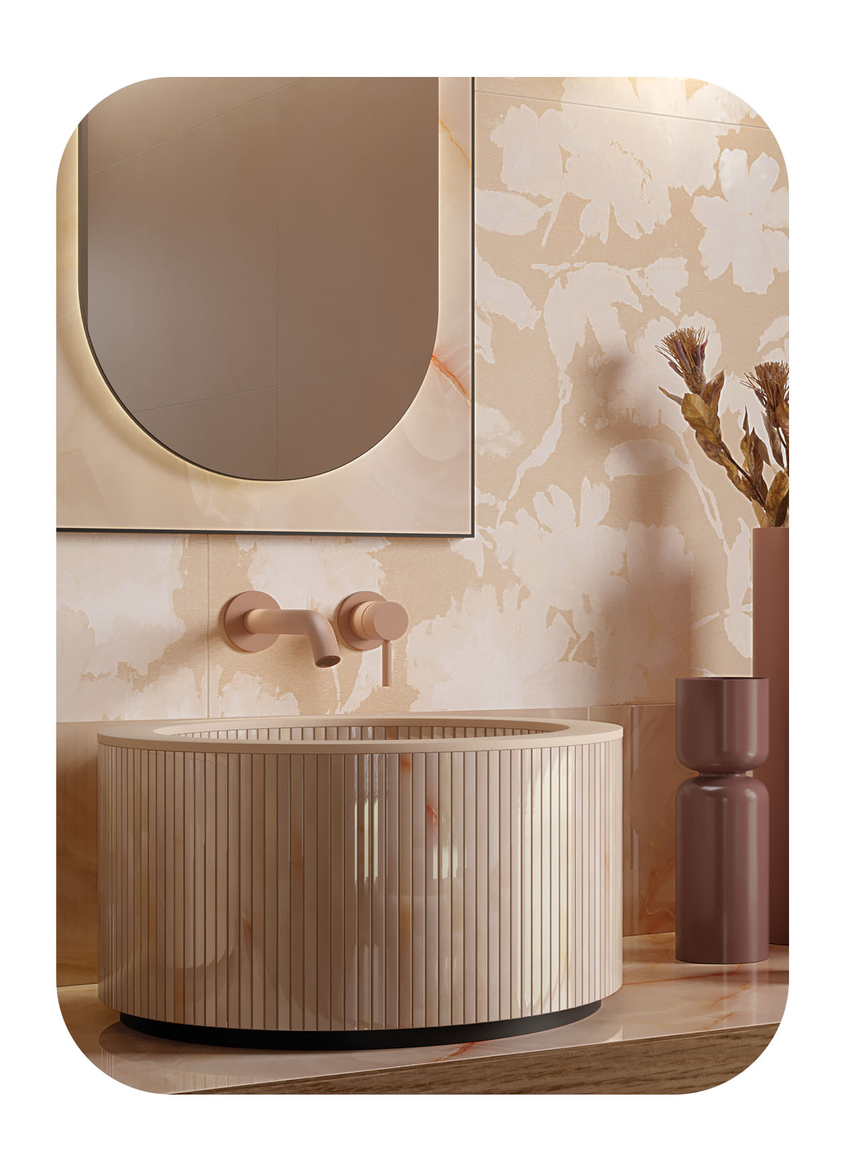 The Total Mirror and Mirror Fade slabs combine the hard-wearing strength of ceramic with a perfectly reflective surface.The ceramic product softly fades into an elegant and versatile mirror.