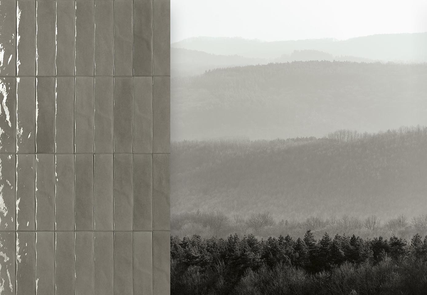Composite of 2 images, left glossy grey ceramic wall tiles juxtaposed with a winter woodland landscape.