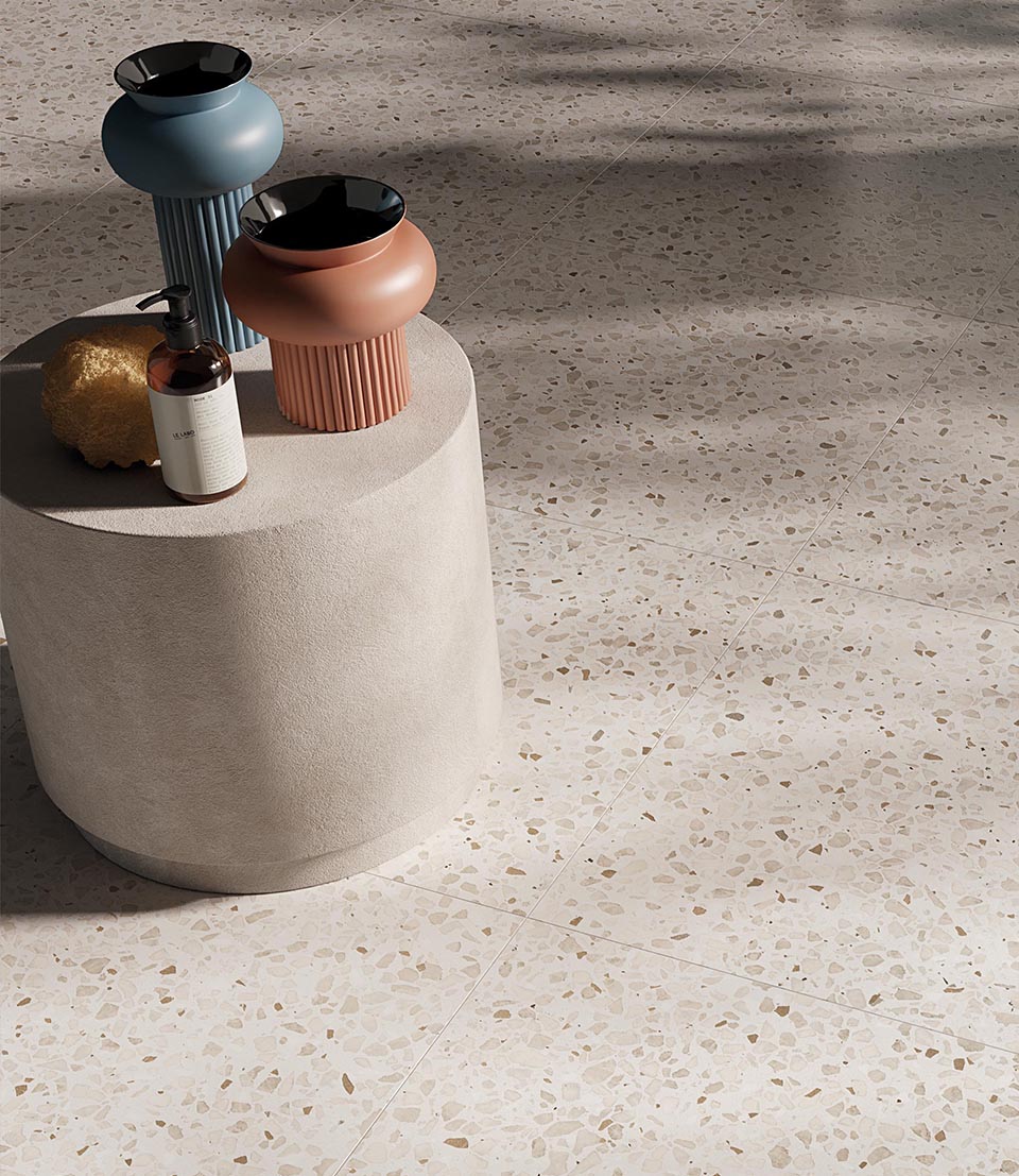 Terrazzo-effect beige stoneware floor tiles with contrasting blue, terracotta and gold irregular furnishing elements.