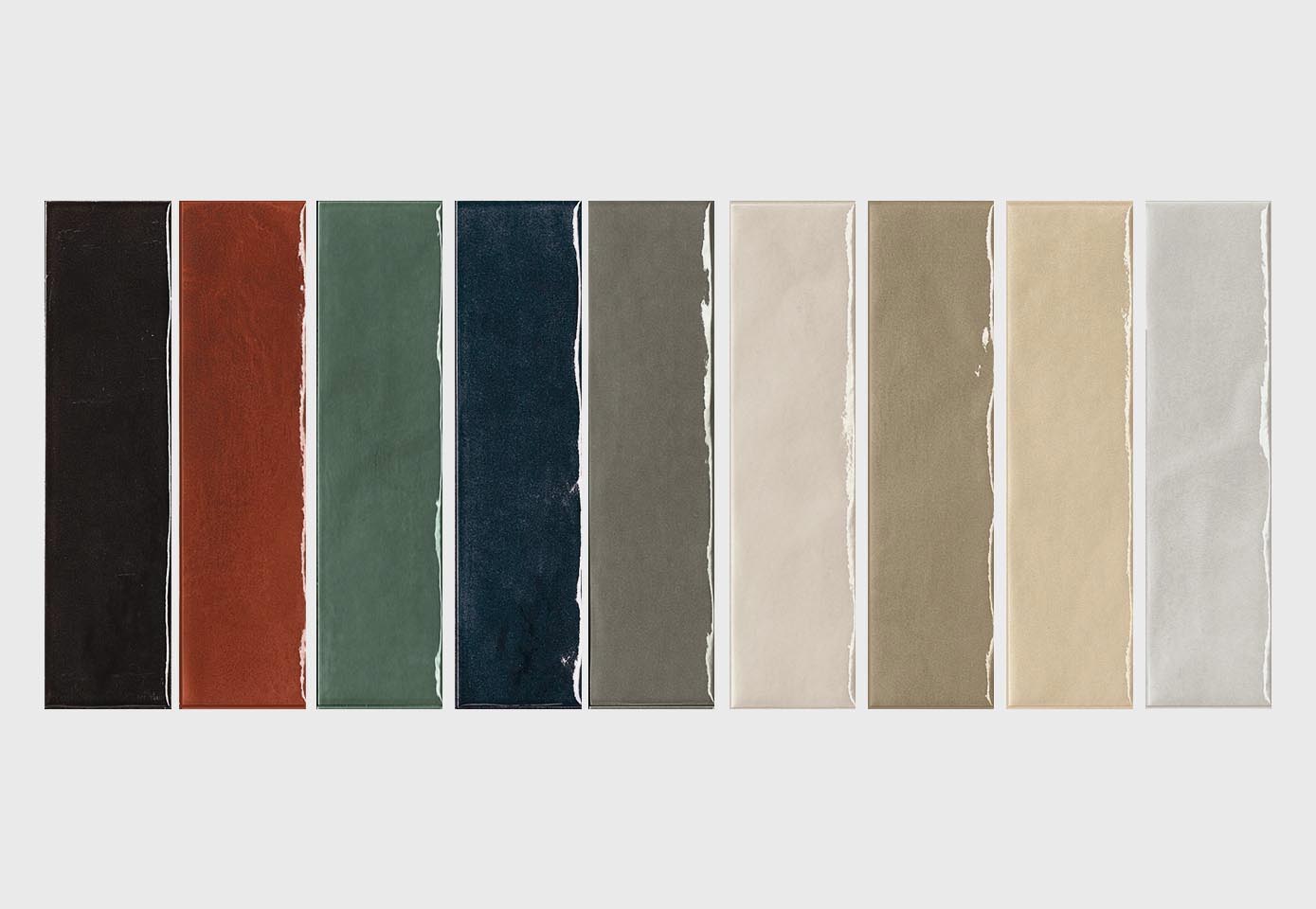 Moodboard of ceramic tiles in glossy vertical format, in nine solid colors including black, rust, green, blue, gray, sand, beige and white.