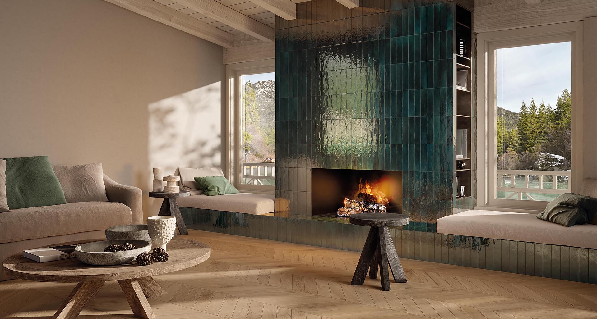 Living room with large fireplace covered in shiny petrol green brick-effect tiles, wood-effect floor with herringbone laying and light natural furnishings, large windows.