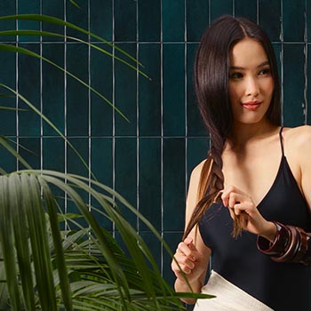 Woman stroking her hair in front of wall covered with forest green glazed brick effect tiles, glossy finish, and ornamental plants.