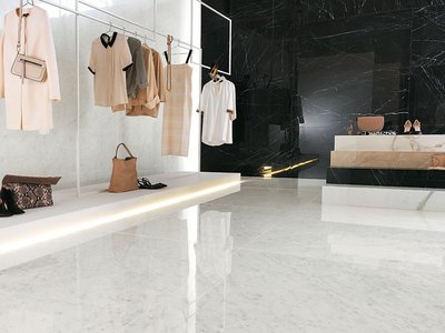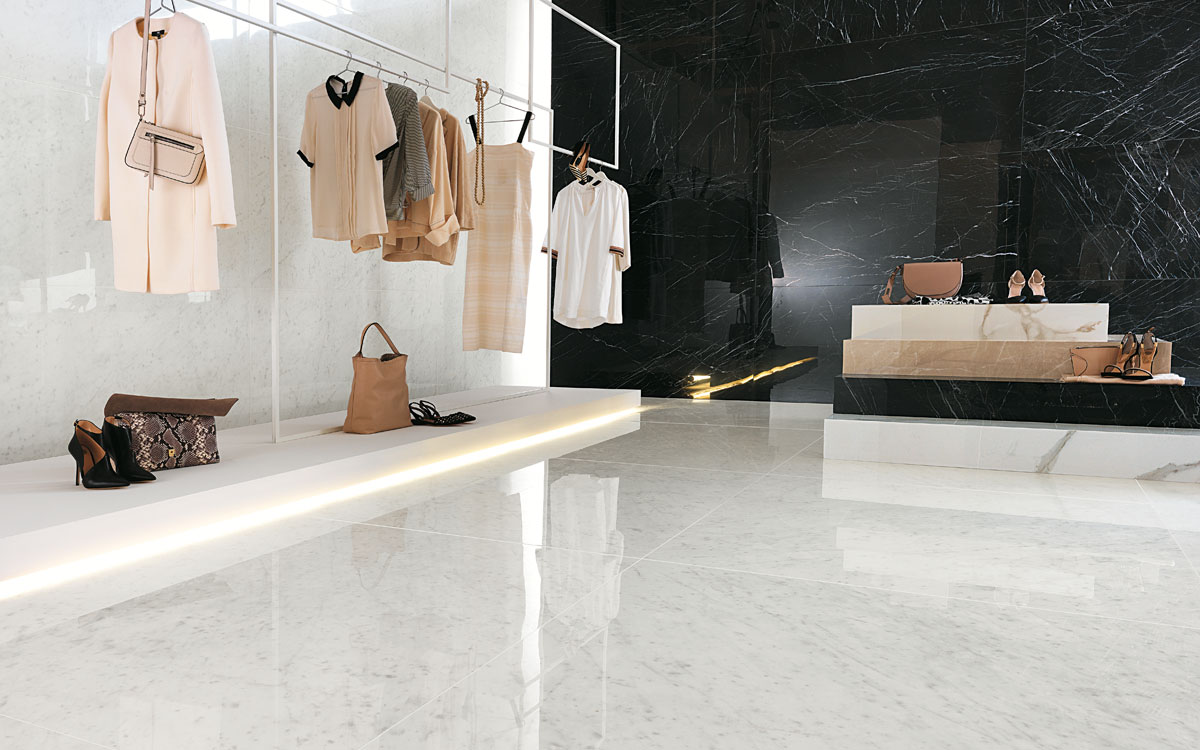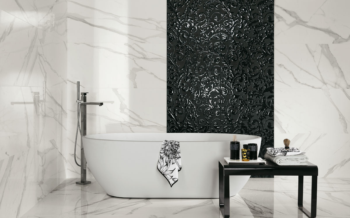 If the full moon isn’t enough for you, you combine Roma Diamond floor and wall tiles by teaming the icy tones of Statuario with the brilliant appeal of Nero Reale. A perfect solution beyond the bathroom too, suitable for high-end retail settings, halls, boutiques and single-brand stores.