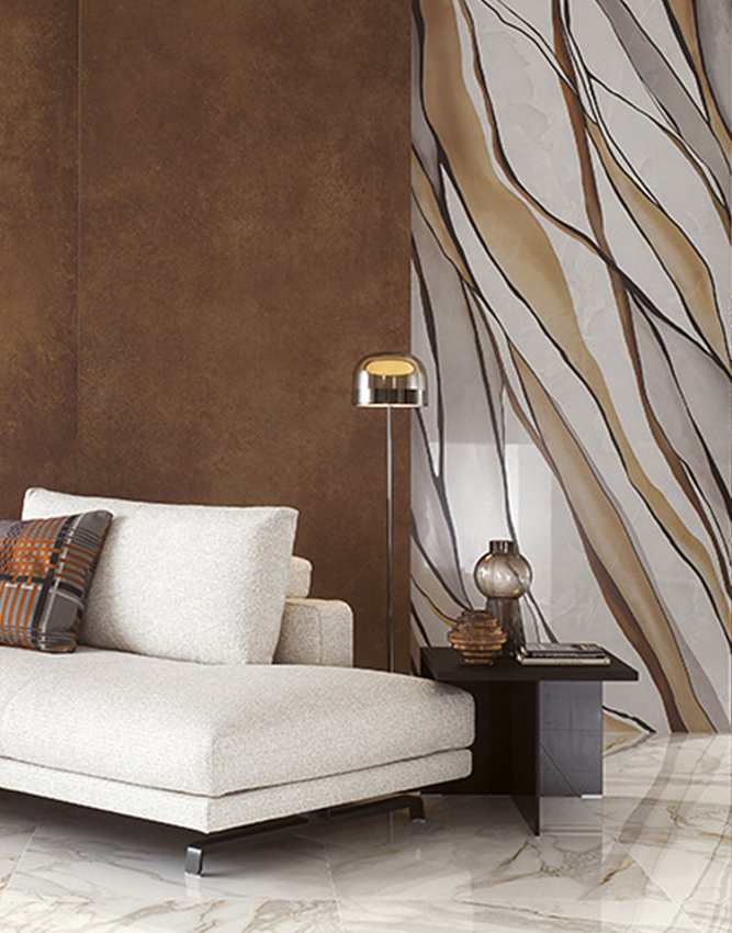 The Roma Gold colour scheme contains references to classic marble, with Carrara Superiore, Calacatta Delicato and extra-glossy Nero Elegante; distinctive shades such as Calacatta Oro, which brings out all the veins in the marble in all their gleaming beauty; the ivory tones of Onice Neve; Onice Miele, a crystalline ochre yellow with vibrant orange-yellow streaks, and the rougher, ultra-modern Iron, Rust and Corten, with their oxidised surfaces.