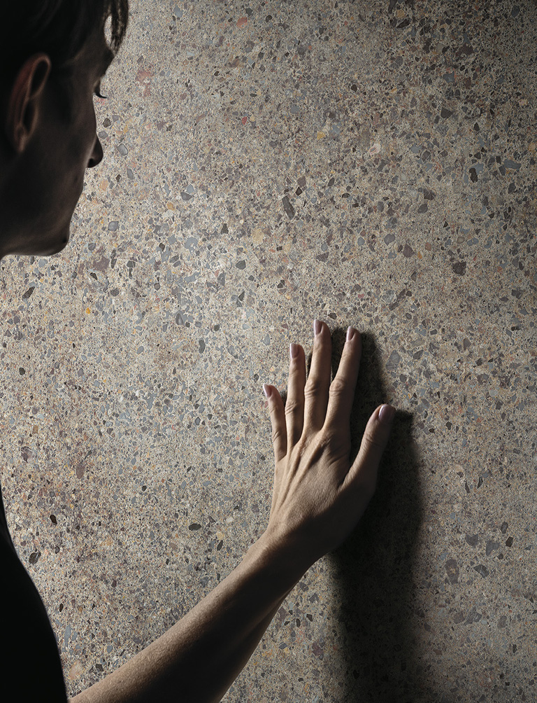 The resulting surface conserves the expressive power of the natural materials but with the technical performance of stoneware: strength, durability and easy care.