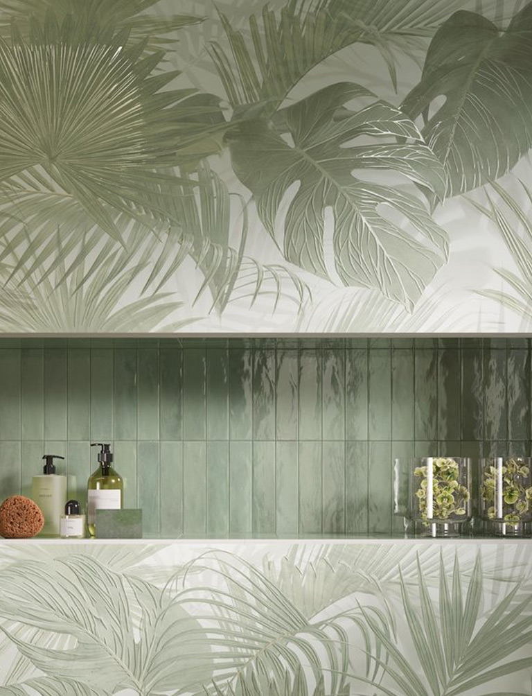 In the same line, Foglie Linfa offers soft, undulating surfaces inspired by the world of botany and flowers, perfect for tiling a bathroom with a fresh, sophisticated, pleasantly tactile touch.