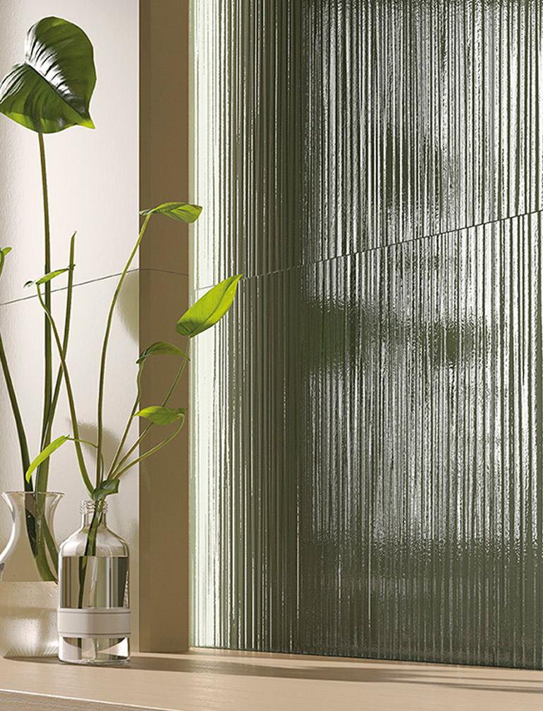 Materia Brillante Riflessi introduces sinuous, intentionally irregular variations to the traditional ribbed tile, with effects that vary depending on the colour: from a forest green, evoking a natural meadow, to sand-inspired ecru shades and sky-blue hues calling forth images of a choppy sea.