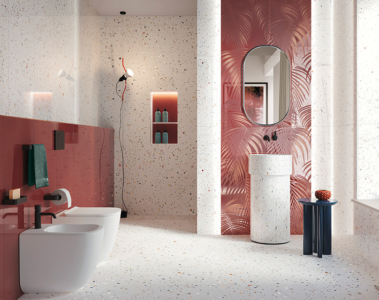 Porcelain stoneware’s technical qualities make it the ideal covering for use as bathroom tiling: easy to clean and durable over time, perfect for damp and heavily-used locations.