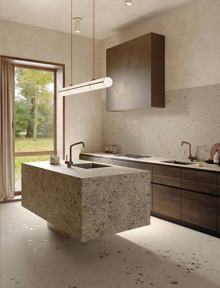 Last but not least, the potential for designing immaculately finished interior design features such as seats, shelves, counters, kitchen islands, focus walls and fireplaces with exquisite, high-performance stoneware and ceramics.