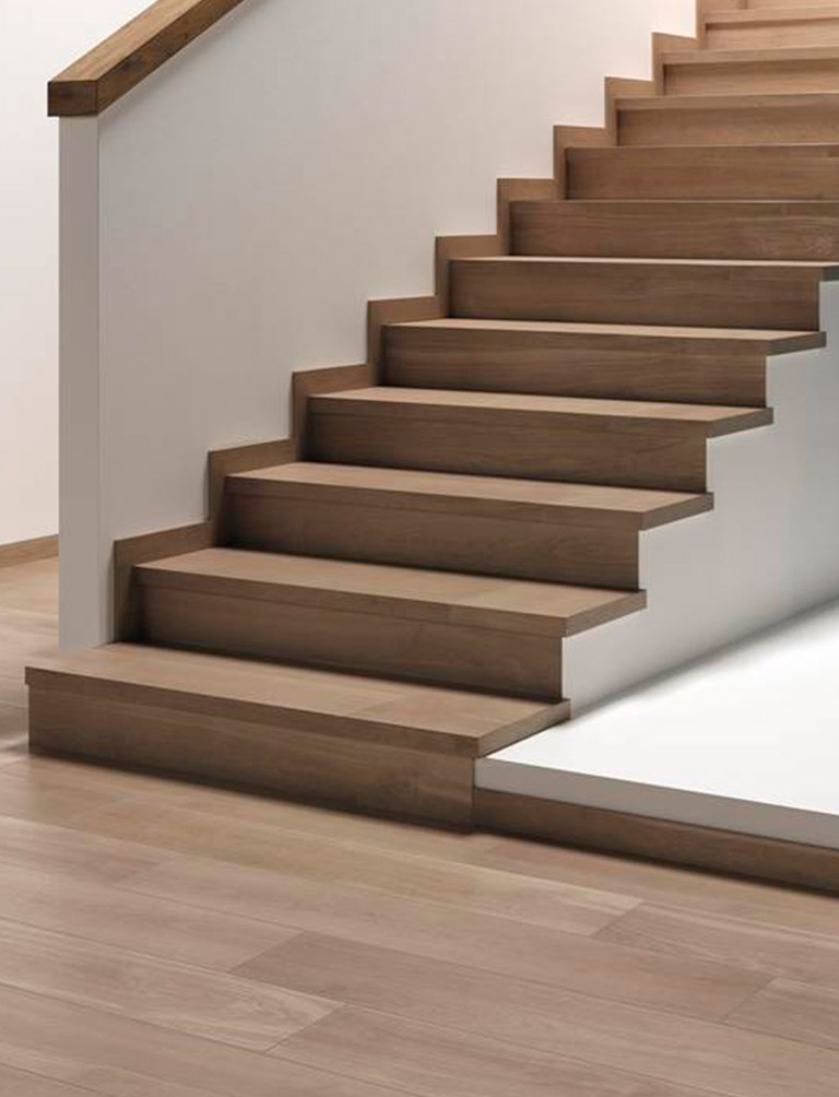 Covering a staircase with the surfaces also chosen for the floors, such as a wood-look stoneware or a stone-look porcelain stoneware is a great strategy that delivers harmony of material and colour.