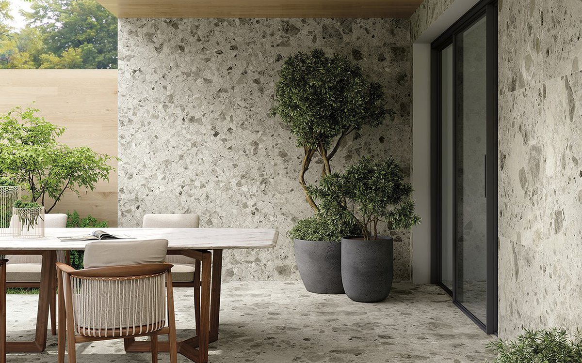 This fundamental need for nature and vitality led to the creation of the Roots collection (opposite), wood-effect porcelain stoneware tiles inspired by the essence of oak, and Nativa collection (in the cover photo), stoneware tiles that combine the natural and raw beauty of stone with contemporary elegance.