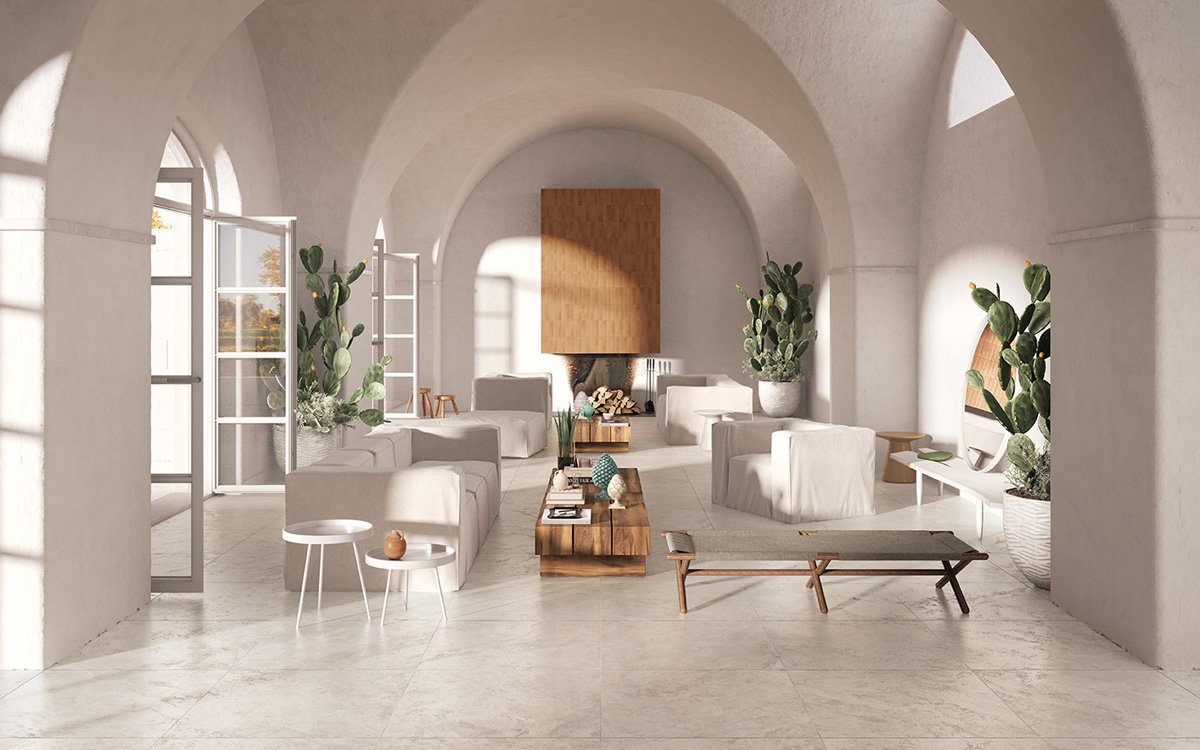 Living room with Mediterranean-style vaults, beige stone-effect flooring and natural furnishings including cacti and light wood.