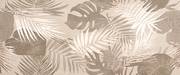 Feminine hand grazes a beige tile with raised leaf effect texture, emphasizing the materiality of the ceramic surface.