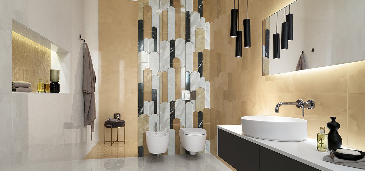 Bathroom design image in Rectangular shape, created with floor tiles ROMA GOLD and wall tiles ROMA GOLD