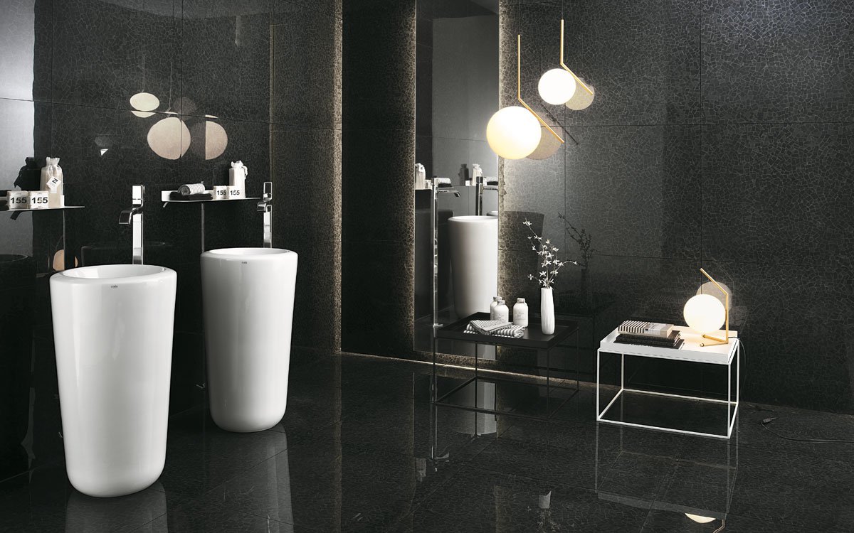 Aquellos que no se contentan con la luna llena pueden combinar los pavimentos y revestimientos de Roma Diamond con los tonos fríos de Statuario y el brillo de Nero Reale. Una solución perfecta incluso fuera del baño, adecuada para tiendas de alta gama, Hall, Boutique y Tiendas monomarca.