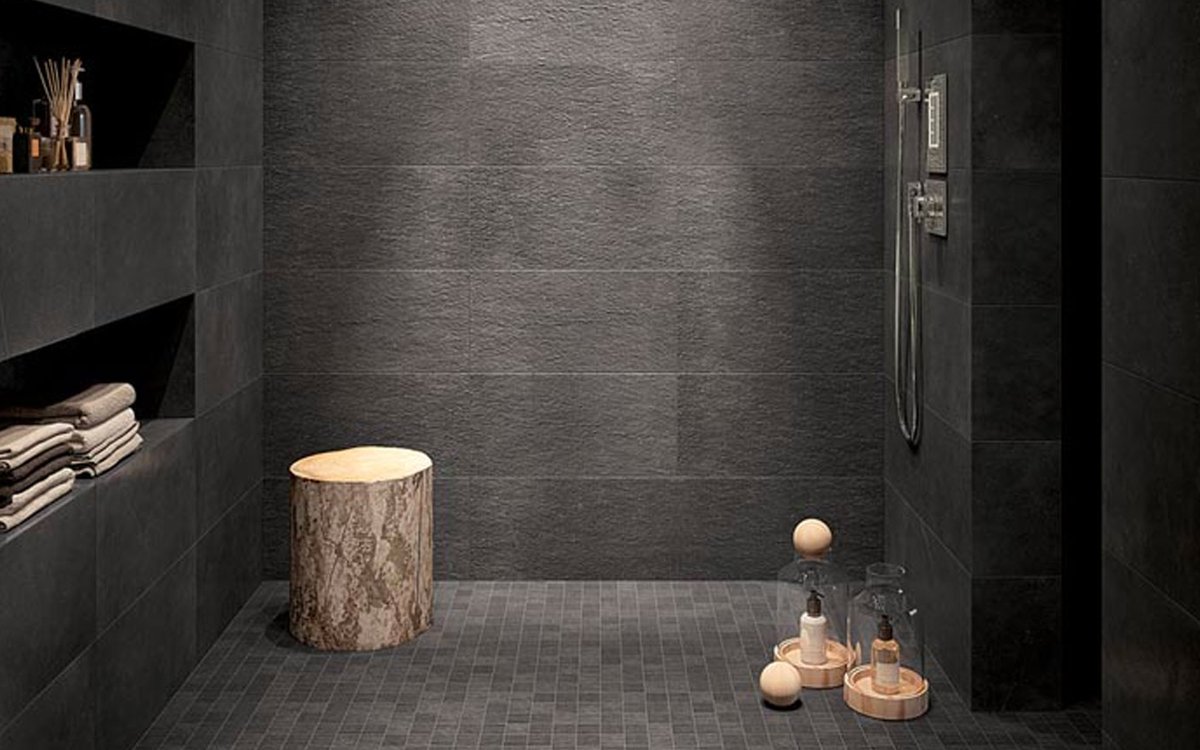El revestimiento de pared MAKU Dark Matt y Dark Out, ideal para realizar un SPA de estilo wabi sabi, da la sensación de estar rodeado de paredes cálidas y rocosas, hermosas en su imperfección, de colores muy relajantes. La armonía en su conjunto se logra con la colocación en el pavimento de Maku Macromosaico Dark Out, un gres porcelánico antideslizante que permite disfrutar del SPA con total seguridad (certificado R 11).