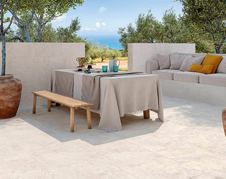 The bright stone-effect porcelain stoneware tiles are brimming with character. Their intentionally flawed look bestows warmth and personality on indoor and outdoor spaces.