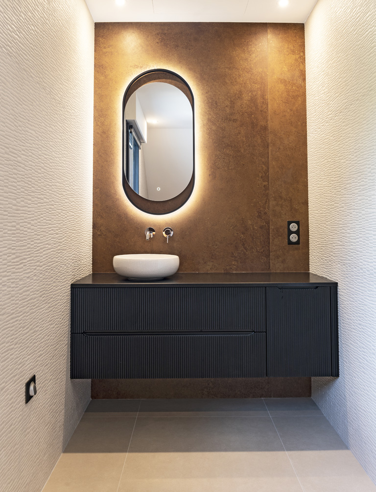 In the bathrooms and shower zone, to decorate the bedhead, the stairwell handrail, the fireplace wall in the living area and the entrance to the Villa, on which OXIDE confers a sophisticated industrial appeal.