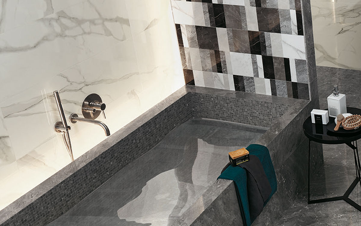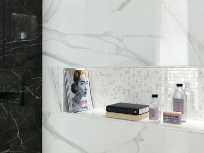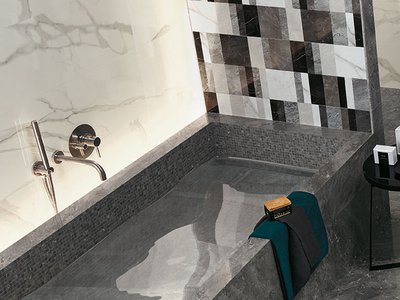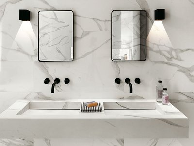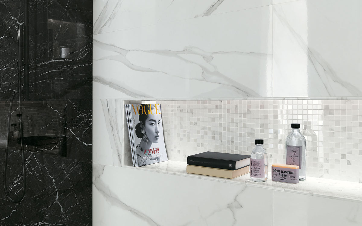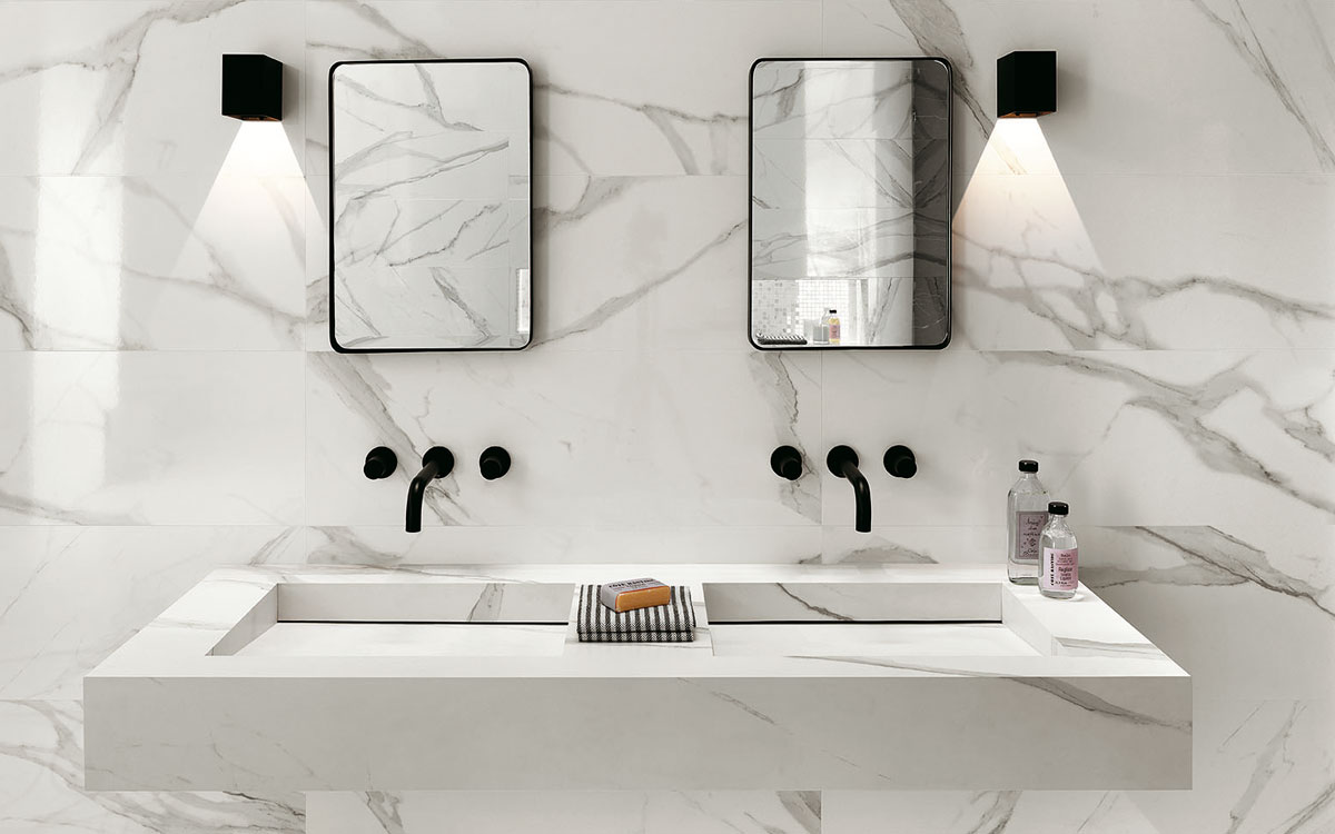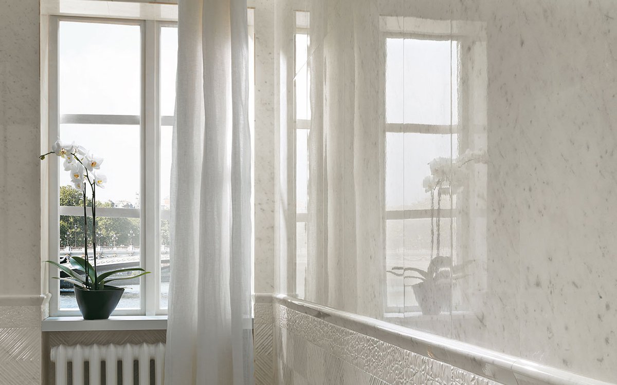 Les revêtements en pâte blanche Calacatta, Statuario, Carrara sont idéaux pour parer de lumière les murs, afin de créer un agréable jeu de vibrations. Beige Duna est parfait pour concevoir des espaces de charme, raffinés et romantiques, Grigio Superiore pour les ambiances sophistiquées et contemporaines. Nero Reale, enfin, pour habiller l’espace avec l'élégance d’une tenue de soirée.