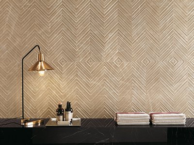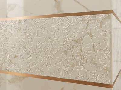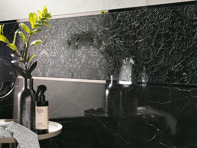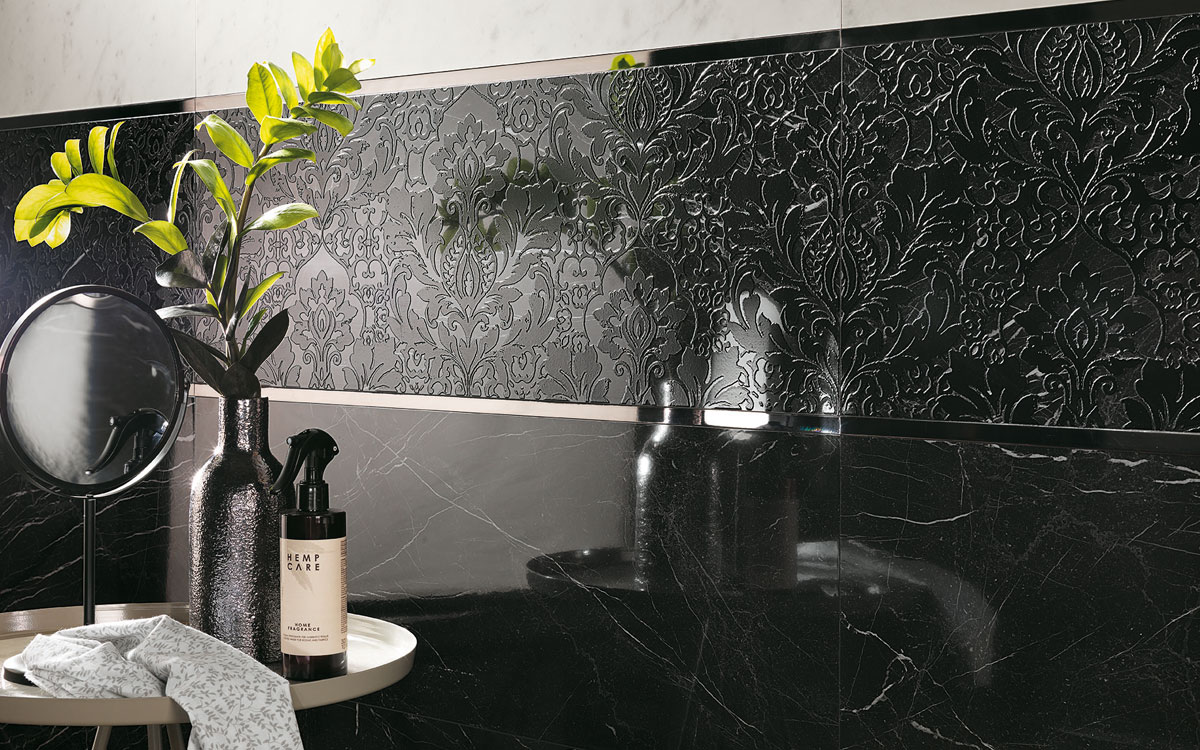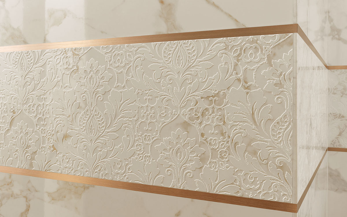 La séduction s’intensifie avec Roma Classic Damasco, surfaces caractérisées par une dentelle extrêmement raffinée qui paraît presque sculptée sur la céramique, en Beige Duna, Calacatta et Nero Reale. L’élément Damasco et les lattes chrome et satinés, en format 1,5x91,5, semblent conçues pour créer des inserts de beauté, des cadres et des boiseries modernes.