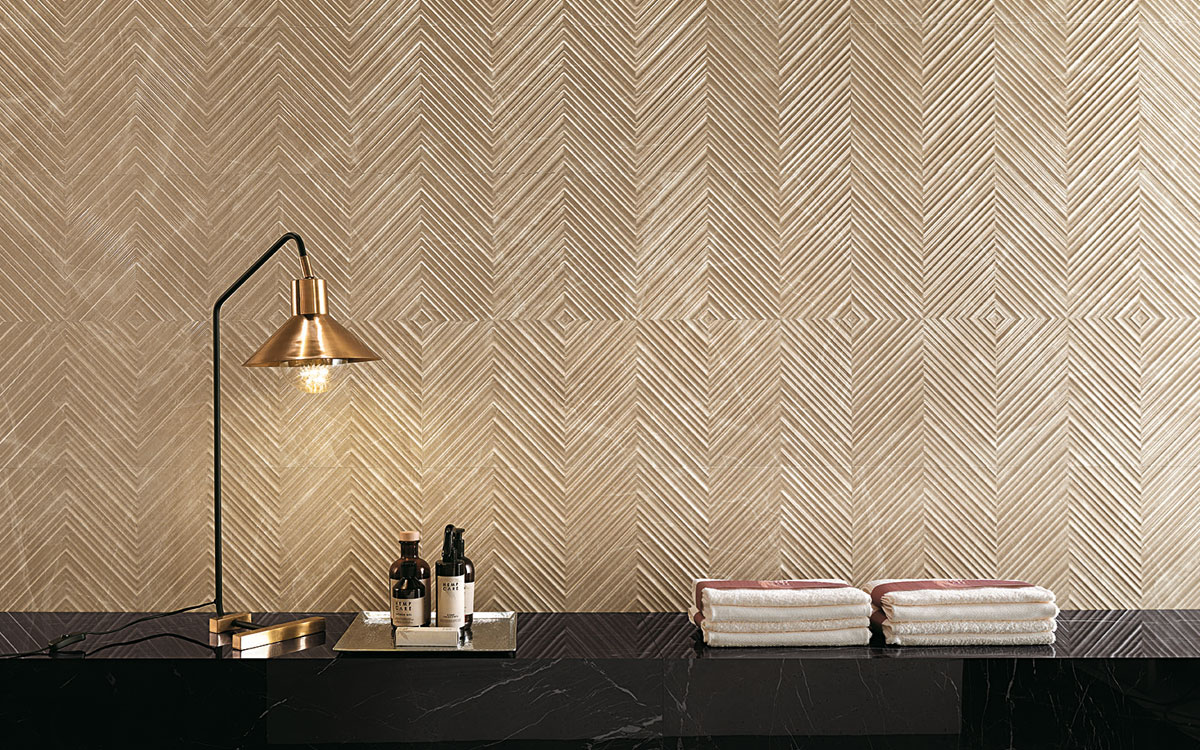 FAP Ceramiche explore la matière au point de créer de petits bijoux de céramique, des surfaces inédites de grande puissance esthétique, à commencer par Roma Classic Peack, une surface tridimensionnelle élégante et fortement tactile, qui permet de composer des murs décoratifs en 3d qui varient selon la pose, laissant une grande liberté d’expression au designer ou au propriétaire du logement.