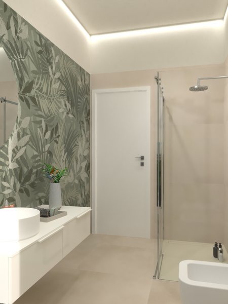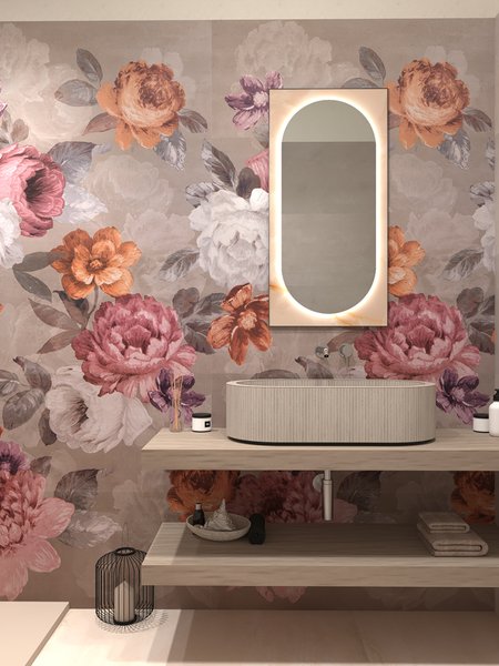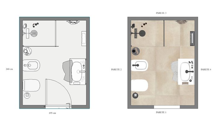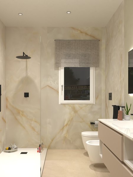 Image du projet de salle de bains de forme Au carré, réalisée avec des carreaux de sol MAKU et carreaux muraux LUMINA STONE