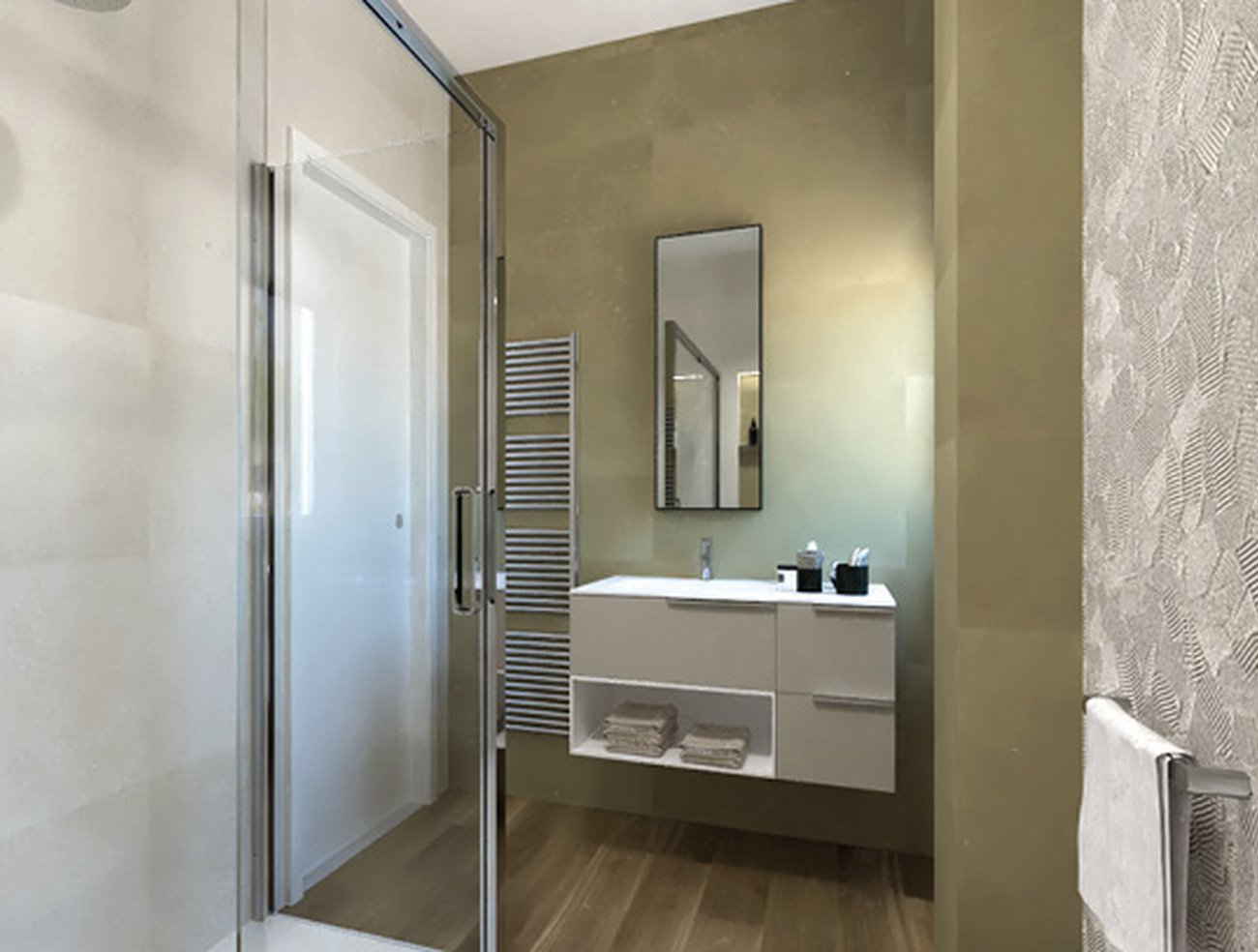 Image du projet de salle de bains de forme Rectangulaire, réalisée avec des carreaux de sol FAPNEST et carreaux muraux LUMINA SAND ART, SUMMER