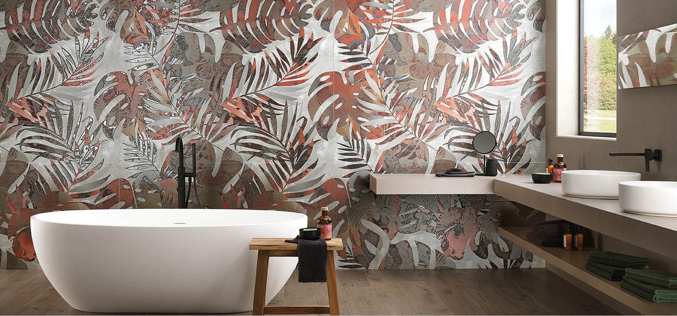Image du projet de salle de bains de forme Rectangulaire, réalisée avec des carreaux de sol SHEER et carreaux muraux BLOOM, FAP MURALS