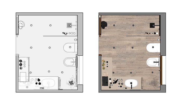 Image du projet de salle de bains de forme Rectangulaire, réalisée avec des carreaux de sol ROOTS et carreaux muraux YLICO