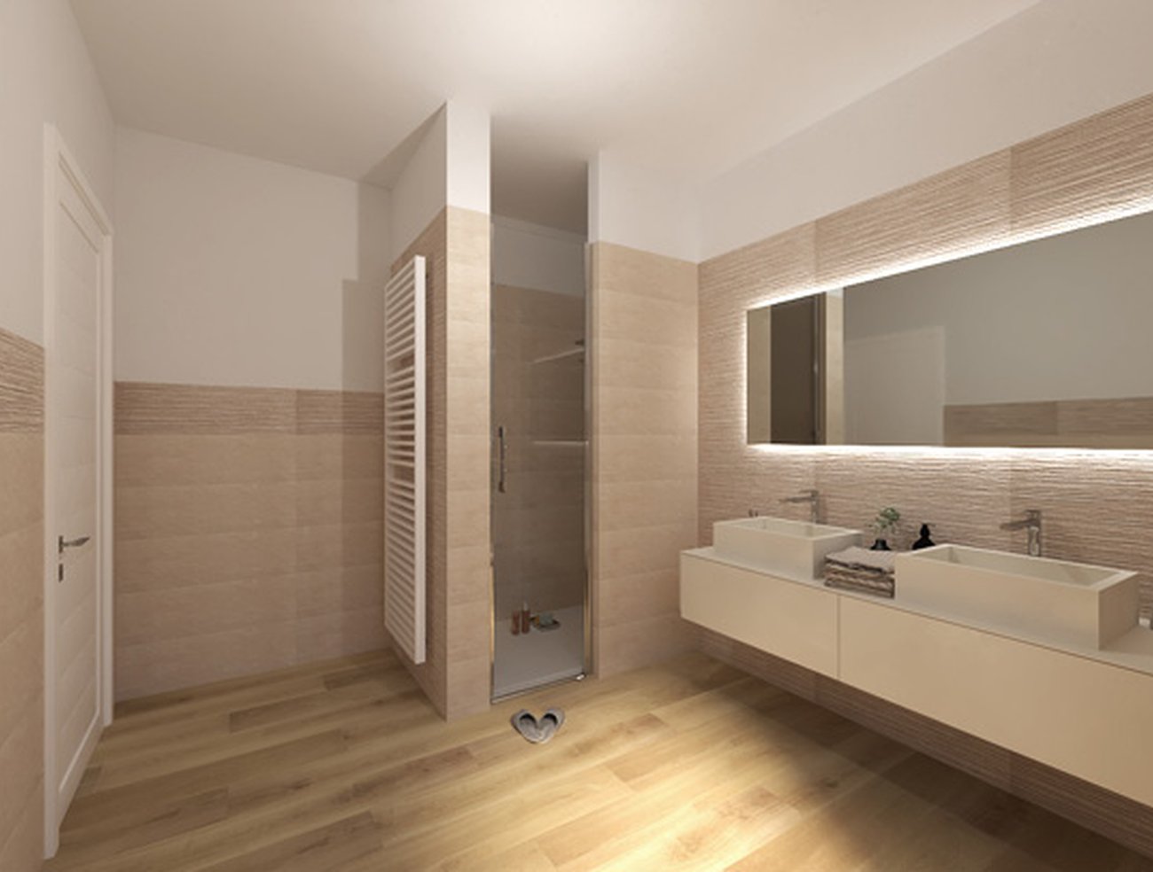 Immagine di progetto bagno di forma Quadrato, realizzato con piastrelle a pavimento FAPNEST e piastrelle a rivestimento MAKU
