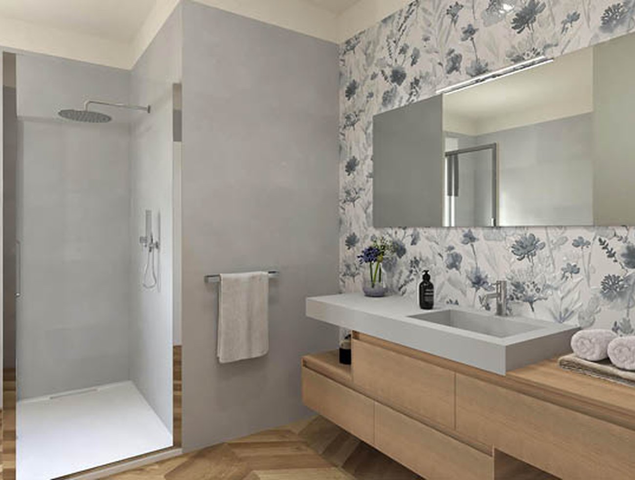 Immagine di progetto bagno di forma Quadrato, realizzato con piastrelle a pavimento FAPNEST e piastrelle a rivestimento MILANO MOOD