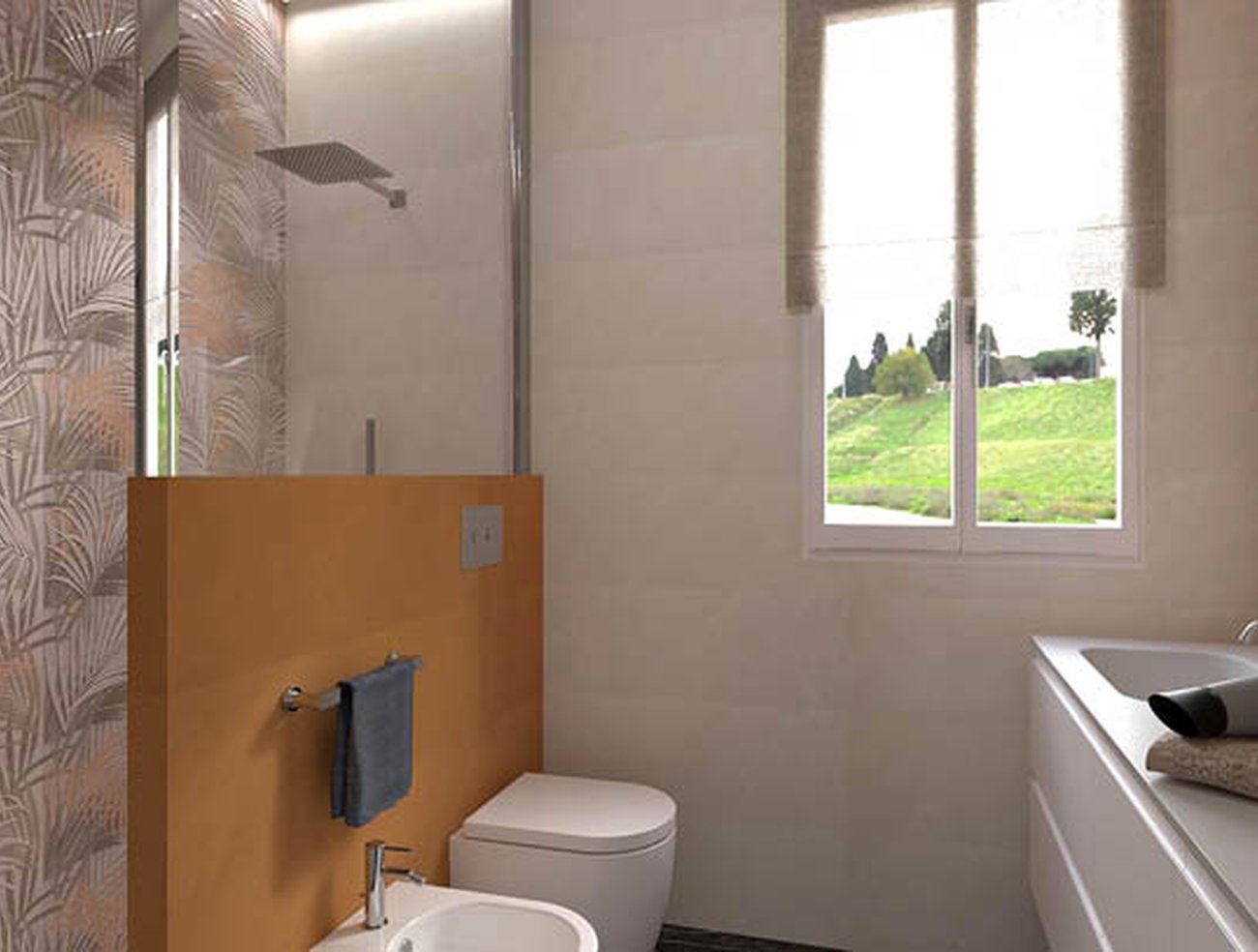Immagine di progetto bagno di forma Quadrato, realizzato con piastrelle a pavimento ROMA DIAMOND e piastrelle a rivestimento DECO&MORE