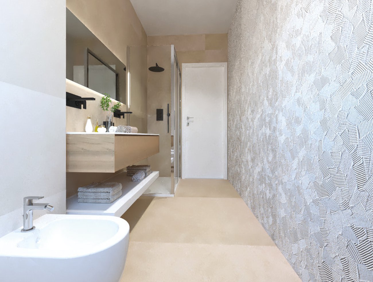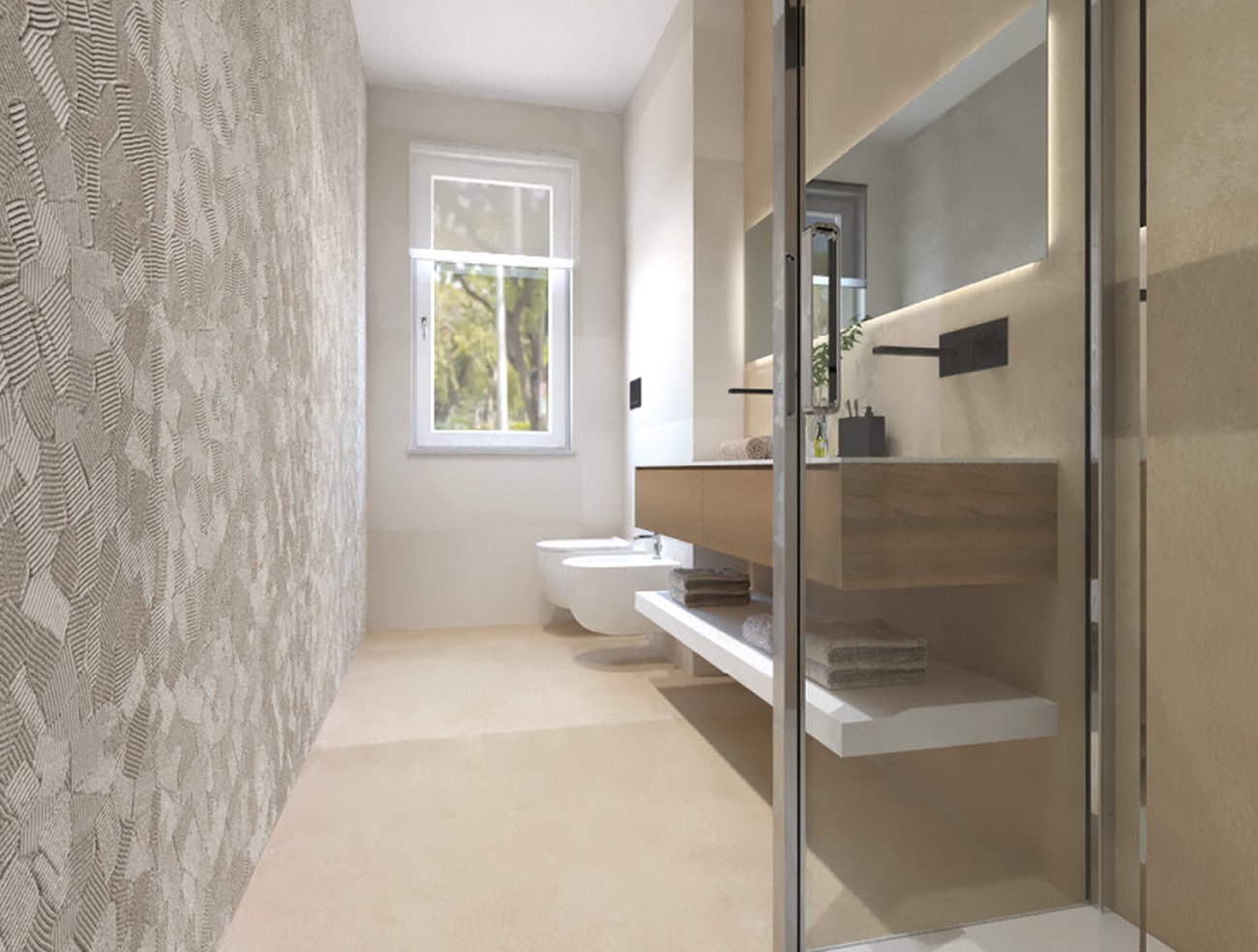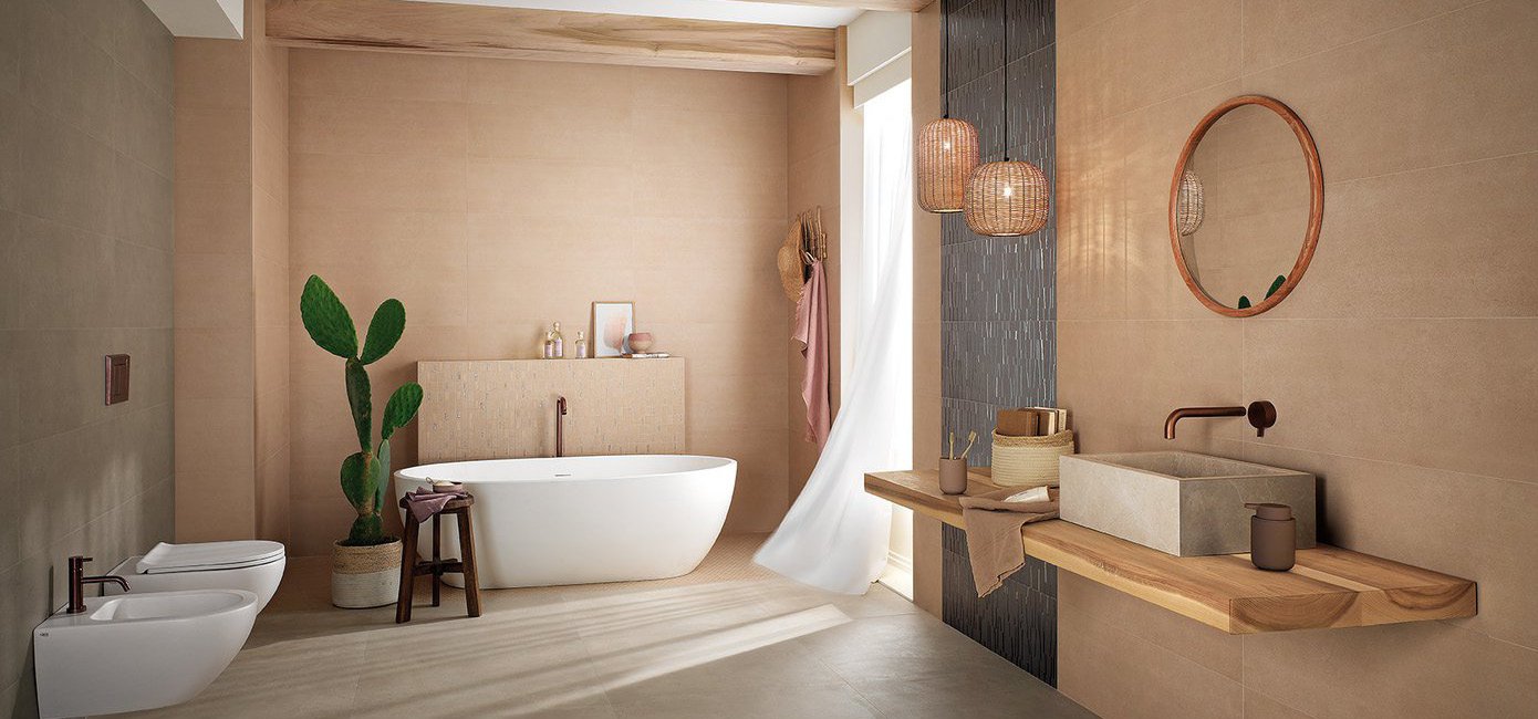 Immagine di progetto bagno di forma Rettangolare, realizzato con piastrelle a pavimento SUMMER e piastrelle a rivestimento LUMINA SAND ART, SUMMER
