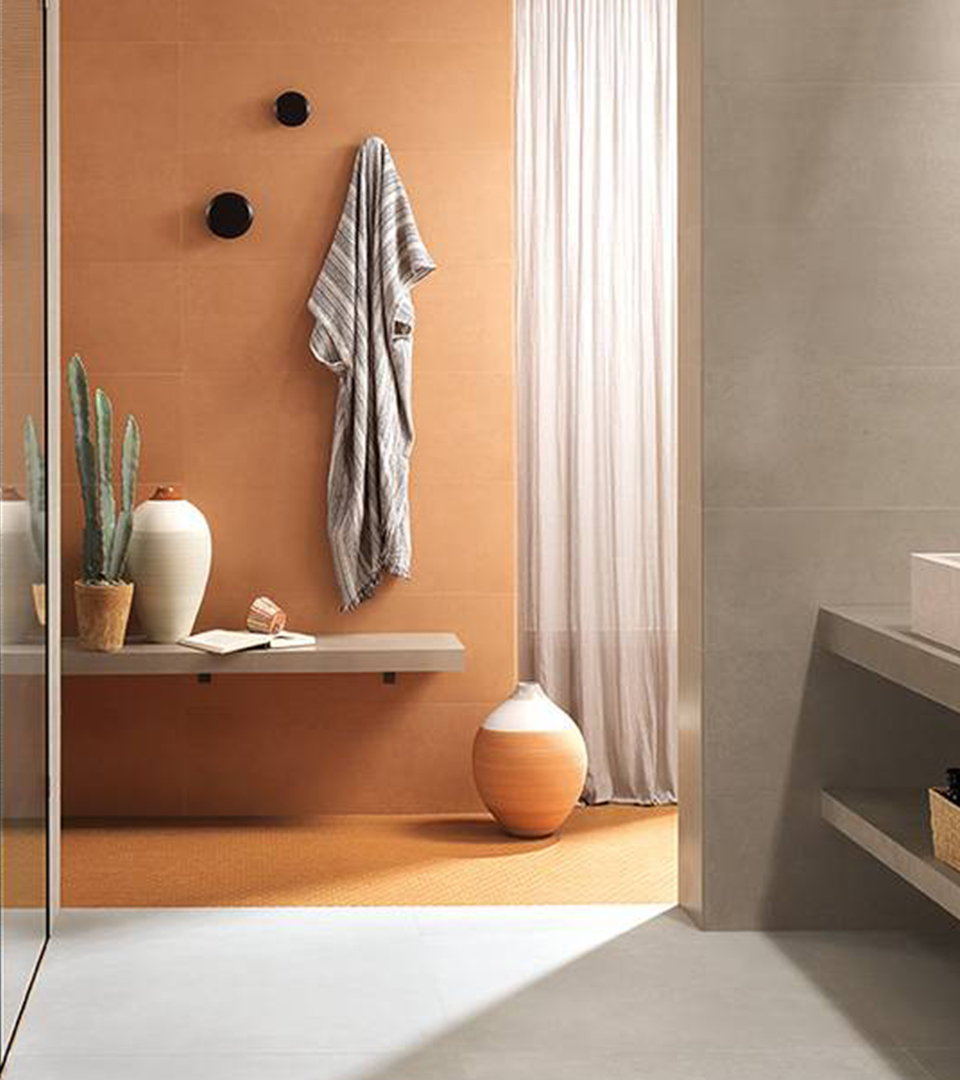 Le tonalità del Marrone sottolineano il lato più caldo e terroso del Tortora, configurando layout fini e accoglienti. Il Bianco enfatizza luminosità e delicatezza del Tortora per ambienti più ariosi e freschi.