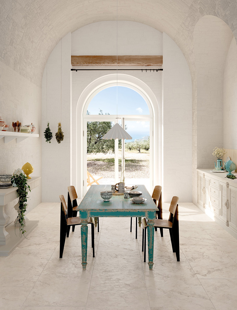 Osservando queste strutture architettoniche, gli interni e i materiali imperfetti e autentici, abbiamo ricreato su gres le estetiche del Sud, con l’obiettivo di trasportare nelle sue magiche atmosfere e far vivere la sensazione di essere in vacanza.