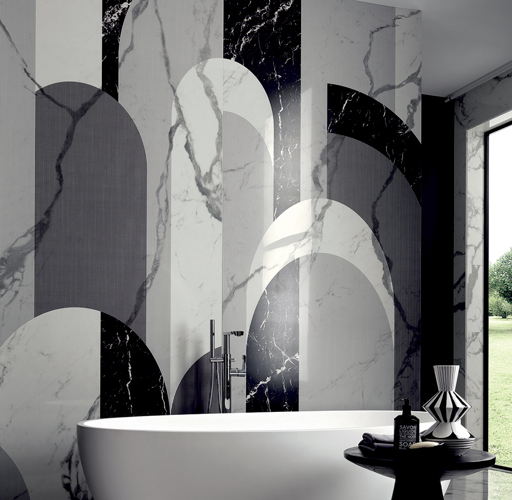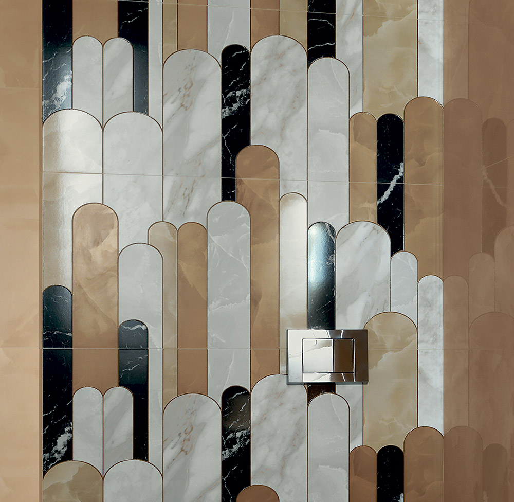 Si spazia da profili decorativi per piastrelle a tema romantico a vere e proprie esplosioni naturalistiche su grandissimo formato, fino a rigorose geometrie, pattern architettonici e piastrelle 3D dal mirabile effetto shining.
