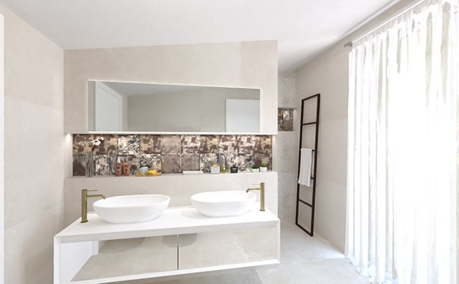 Proprio perché Wall Tiles, le lastre 80x160 cm sono leggere, facili da tagliare e forare e, non meno importante, di facile movimentazione. Le ampie superfici permettono di valorizzare al meglio la bellezza delle lastre: con Bloom è possibile realizzare pareti unite per un effetto carta da parati utilizzando tre diverse lastre, fino al soffitto, ad altezza standard di 240 cm. Una soluzione che dialoga con il mondo dell’interior design contemporaneo, capace di combinare estetica e funzionalità in modo innovativo.