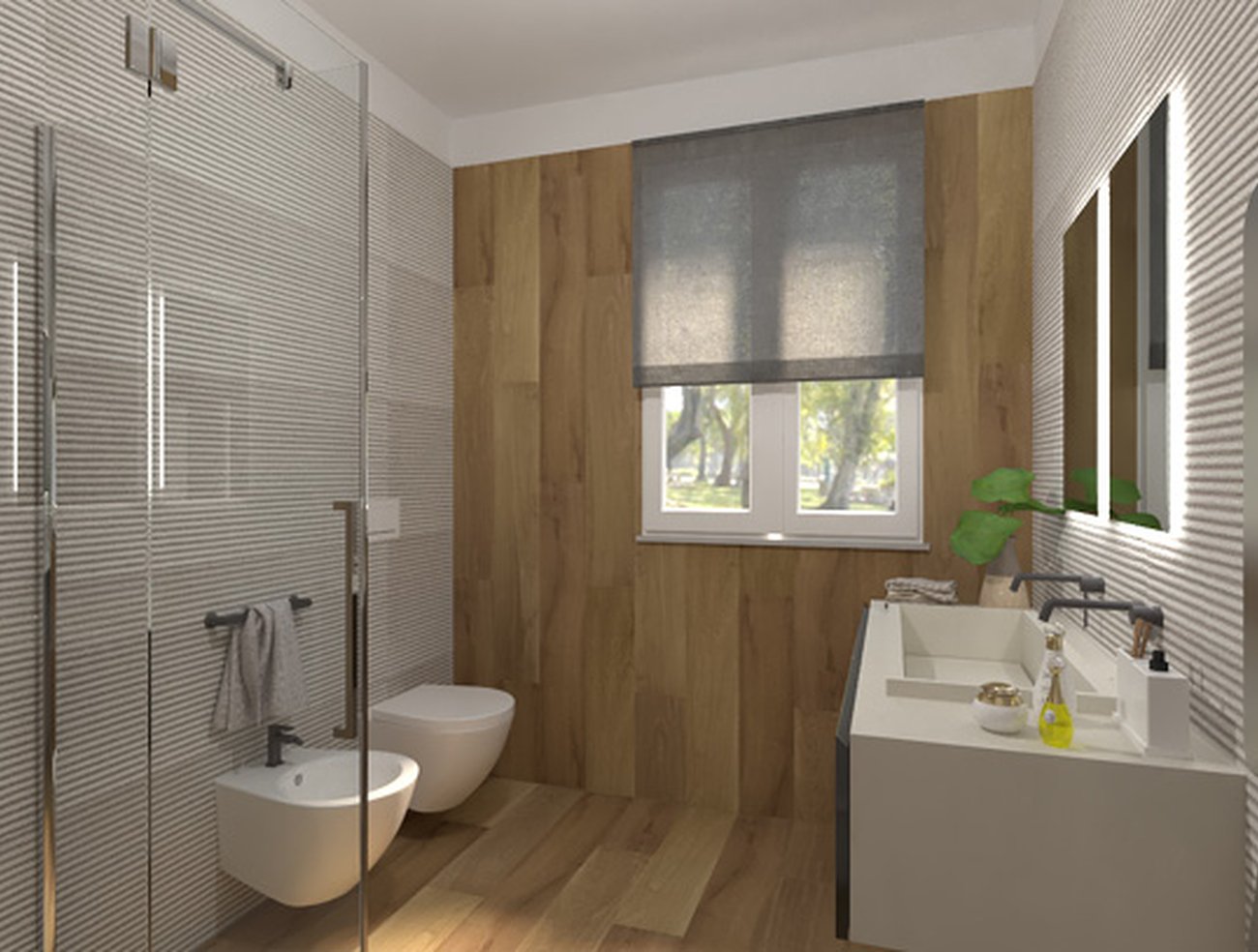 Immagine di progetto bagno di forma Rettangolare, realizzato con piastrelle a pavimento FAPNEST e piastrelle a rivestimento LUMINA SAND ART, FAPNEST