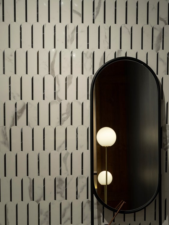 Immagine ambiente Bagno, realizzato con piastrelle della collezione: ROMA GOLD - Bianco, Nero