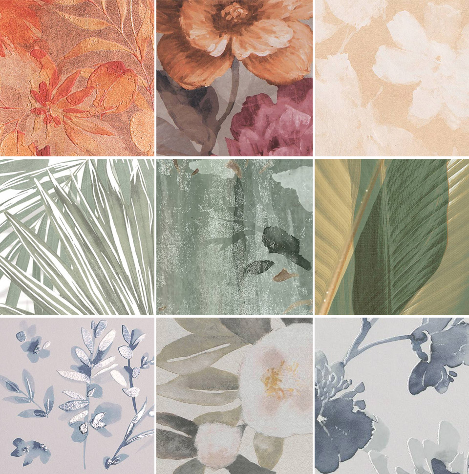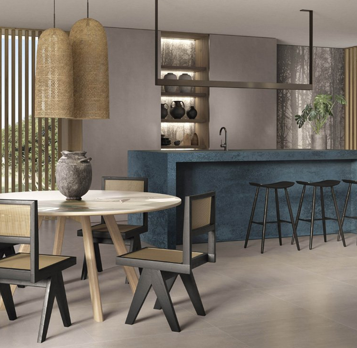 The large 120x278 size, featuring a maxi nature-inspired pattern, can be used to decorate an entire wall with just a few tiles, bringing a breath of fresh air into the room with sophisticated, relaxing shades of grey and blue.