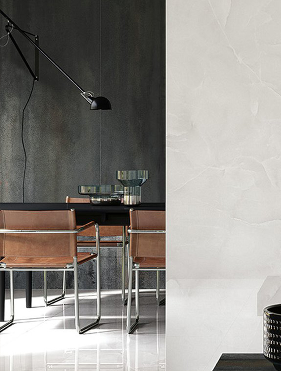 И в этом случае крупноформатная плитка – это самое эффективное решение для оформления гостиной или конкретной зоны дома, стены залы или кухни в случае, если вы хотите создать атмосферу офиса и рабочего пространства. FAP Murals Texture Macro идеально подходит для организации современного и творческого помещения. Для более элегантной гостиной или строгого кабинета в совершенстве подойдут плиты Iron Roma Gold. Эта коллекция, состоящая из керамогранита и настенной плитки, черпает вдохновение в различных видах и форматах мрамора. Ее отличают элегантные и сверкающие декоративные поверхности в классическом и эклектичном стиле.